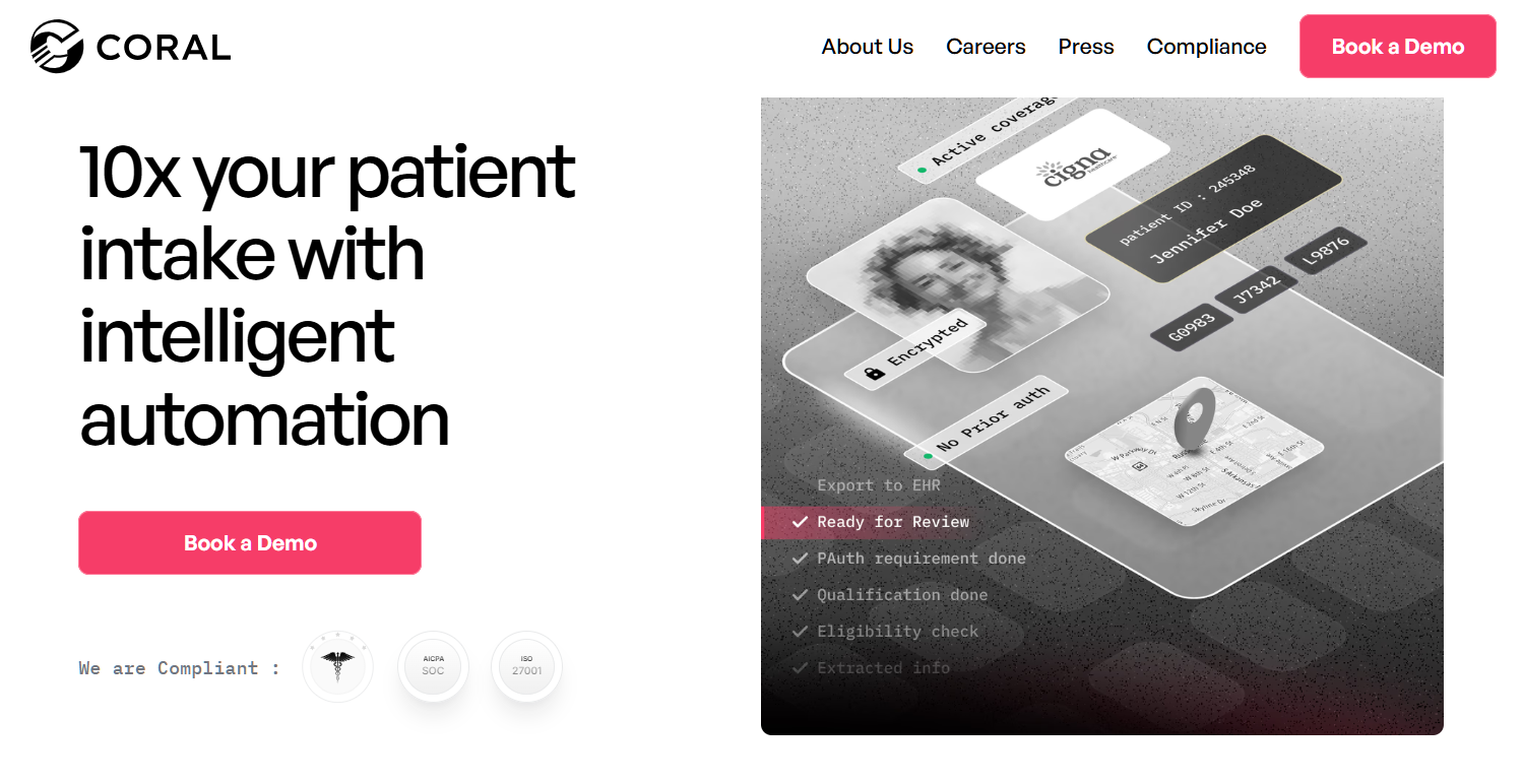 Coral’s models have now reached 99.7% accuracy on the document types that define healthcare’s back office: handwritten fax forms, scanned insurance cards, prior authorization templates, payer portal screens. Complete patient intakes, including the most complex cases the platform handles, now run in under five minutes, and when the information is missing, which happens frequently, Coral can seamlessly work with all the relevant parties to get information and process a patient’s case.
